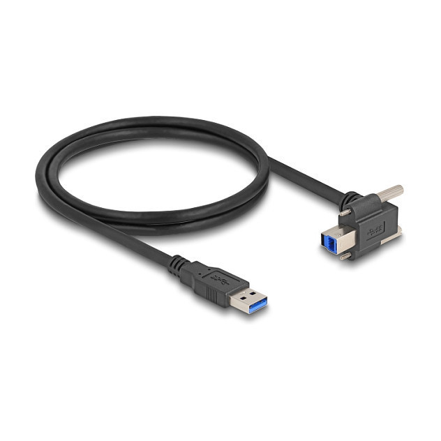 "DeLOCK USB 5 Gbps Cable USB Type-A male straight to USB Type-B male with screw distance 22 mm 90° upwards angled 1 m black. Cable length: 1 m. Connector 1: USB A, Connector 2: USB B, USB version: USB 3.2 Gen 1 (3.1 Gen 1), Maximum data transfer rate: 5 Gbit/s, Product colour: Black"\n"This USB cable by Delock enables the connection between a device with a USB Type-Bconnector and a PC or a laptop equipped with a free USB Type-A port.