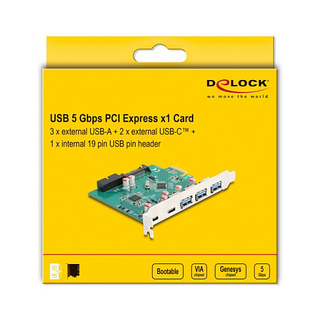 "DeLOCK USB 5 Gbps PCI Express x1 Card to 3 x external Type-A + 2 x external USB Type-C female and 1 x internal 19 pin USB pin header male. Host interface: PCIe, Output interface: SATA, USB 3.2 Gen 1 (3.1 Gen 1), USB Type-C, Host interface gender: Female. Product colour: Multicolour"\n"This PCI Express card by Delock expands the PC by three external Type-A and two external USB Type-C™ ports as well as one internal 19 pin USB pin header male port. Different USB devices such as USB flash memory, card reader, external enclosure etc. can be connected. A maximum data transfer rate of up to 5 Gbps can be reached.