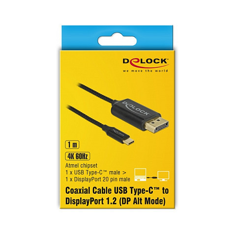 "DeLOCK 83709. Maximum resolution: 3840 x 2160 pixels, Chipset: Atmel. Product colour: Black"\n"This cable by Delock enables the connection of a DisplayPort monitor to a device with USB-C or Thunderbolt 3 port, such as a MacBook or a Chromebook. The interface has to support the DisplayPort Alternate Mode. The coaxial cable is very flexible and easy to handle due to its small diameter."