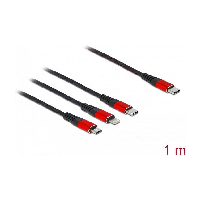 "DeLOCK USB Charging Cable 3 in 1 USB Type-C to Lightning / Micro USB / USB Type-C 1 m black / red. Cable length: 1 m. Connector 1: USB C, Connector 2: USB C/Micro-USB B/Lightning, USB version: USB 2.0, Product colour: Black, Red"\n"This 3 in 1 charging cable by Delock can be used for charging of different devices e.g. tablets or smartphones with Lightning™, Micro USB-B or USB Type-C™ interface through a USB power source.