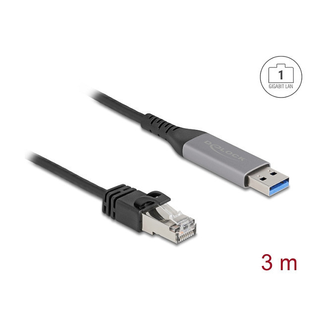 "DeLOCK USB LAN Cable USB Type-A to RJ45 Gigabit Ethernet 3 m. Cable length: 3 m, Cable standard: Cat6, Connector 1: USB Type-A, Connector 2: RJ-45, Data transfer rate: 1000 Mbit/s, Product colour: Black, Anthracite"\n"This USB to LAN cable by Delock enables a stable, wired network connection to a PC or Laptop with USB Type-A port.