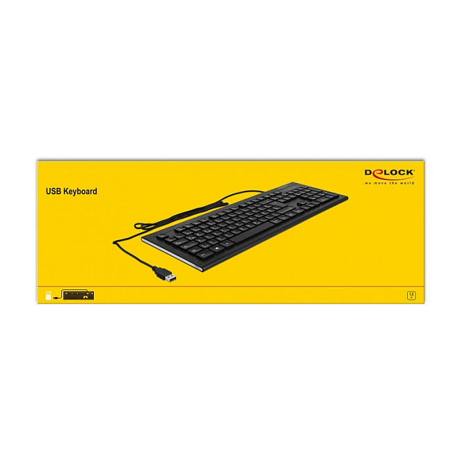 "DeLOCK 12672. Keyboard form factor: Full-size (100%). Keyboard style: Straight. Connectivity technology: Wired, Device interface: USB, Keyboard layout: QWERTZ. Cable length: 1.5 m. Recommended usage: Office. Product colour: Black"\n"This wired USB keyboard by Delock with different multimedia keys, convinces with its elegant and flat design.