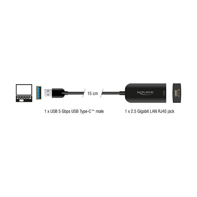 "DeLOCK 66045. Connector 1: USB 5 Gbps Type-A, Connector 2: 2.5 Gigabit LAN RJ45, Cable length: 0.15 m. Product colour: Black"\n"The adapter by Delock expands a PC or laptop by one network interface via the USB Type-A interface.