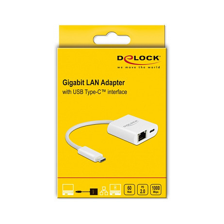 "DeLOCK USB Type-C Adapter to Gigabit LAN 10/100/1000 Mbps with Power Delivery port white. Connectivity technology: Wired, Host interface: USB Type-C, Interface: Ethernet. Maximum data transfer rate: 5000 Mbit/s. Product colour: White"\n"The adapter by Delock expands a PC or laptop by one network interface via the USB Type-C interface. In addition, the adapter can also be operated on a Thunderbolt 3 interface.