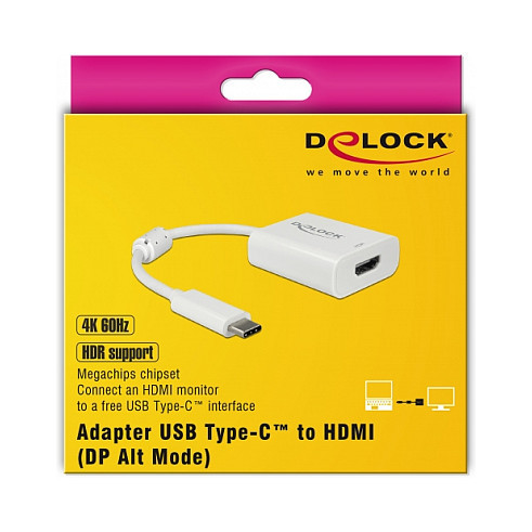 "DeLOCK 63937. Cable length: 0.1 m, Connector 1: USB Type-C, Connector 2: HDMI. Package type: Box"\n"This Delock adapter is suitable for the connection of an HDMI monitor to a computer with USB-C™ interface and DisplayPort alternate mode support. Thus, the adapter can be connected to different laptops like MacBook, Chromebook and similar. In addition, the adapter can also be operated on a Thunderbolt™ 3 interface. By the support of the HDR (High Dynamic Range) function, the screen can be displayed sharper, clearer and more vivid."
