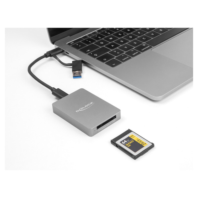 "DeLOCK USB Type-C Card Reader in aluminium enclosure for CFexpress or XQD memory cards. Compatible memory cards: CFexpress Type B, XQD, Product colour: Grey, Data transfer rate: 10000 Mbit/s. Interface: USB 3.2 Gen 1 (3.1 Gen 1) Type-C. Width: 49 mm, Depth: 71 mm, Height: 11 mm. Quantity per pack: 1 pc(s), Package type: Hanging box. Cables included: USB Type-C to USB Type-C, Interface adapters included: USB Type-C - USB Type A"\n"The card reader by Delock can be used for reading and writing XQD or CFexpress memory cards. The card reader can be connected to a PC or laptop via the USB Type-C™ or Type-A interface.