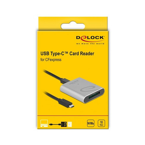 "DeLOCK USB Type-C Card Reader with aluminium enclosure for CFexpress memory cards. Compatible memory cards: CFexpress, Product colour: Silver, Data transfer rate: 10000 Mbit/s. Interface: USB 3.2 Gen 1 (3.1 Gen 1) Type-C. Width: 58 mm, Depth: 63 mm, Height: 15 mm. Quantity per pack: 1 pc(s), Package type: Hanging box. Cables included: USB Type-C to USB Type-C"\n"The card reader by Delock can be used for reading and writing CFexpress memory cards. The card reader can be connected to a PC or laptop via the USB Type-C interface."