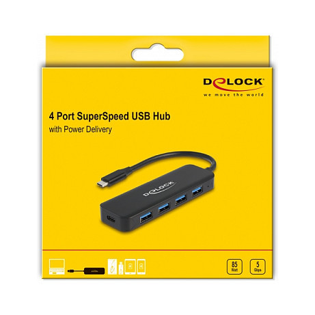 "DeLOCK USB Type-C Hub 4 Port USB 3.2 Gen 1 with Power Delivery 85 Watt. Host interface: USB 3.2 Gen 1 (3.1 Gen 1) Type-C, Hub interfaces: USB 3.2 Gen 1 (3.1 Gen 1) Type-A, USB 3.2 Gen 1 (3.1 Gen 1) Type-C. Data transfer rate: 5000 Mbit/s, Product colour: Black, Housing material: Metal. Windows operating systems supported: Windows 10, Windows 10 x64, Windows 11, Windows 8.1, Windows 8.1 x64, Linux operating systems supported: Linux Kernel 5.8, Other operating systems supported: Android. Width: 35 mm, Depth: 108 mm, Height: 13 mm"\n"This solid USB hub by Delock with metal housing can be connected by the USB Type-C interface to a computer, laptop or mobile device. Up to 4 USB Type-A devices can be connected to the hub.