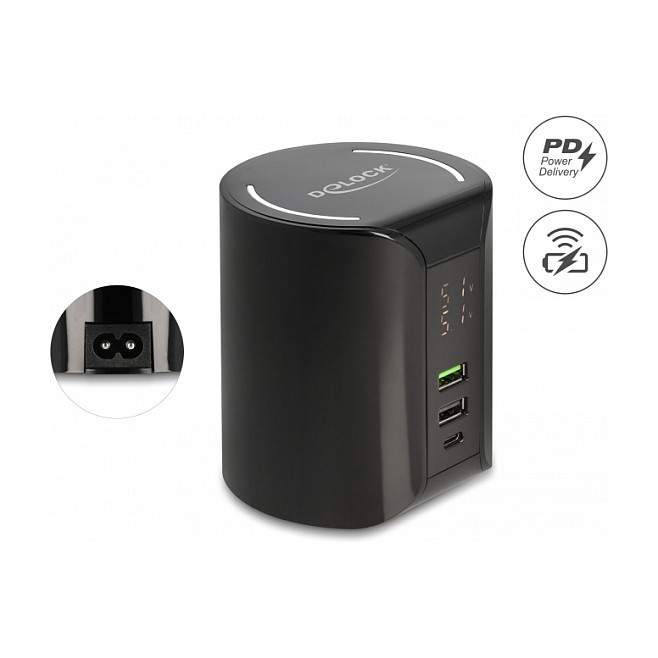 "DeLOCK USB and Wireless Charger 1 x USB Type-C PD + 2 x USB Type-A with 58 W. Charger type: Indoor, Power source type: AC, Charger compatibility: Smartphone. Input voltage: 100 - 240 V. USB 2.0 ports quantity: 1, USB Type-C ports quantity: 1, Wireless charging, Fast charging, Power protection features: Short circuit. Cable length: 1.2 m, Product colour: Black"\n"This USB Power Delivery (PD) charger by Delock can be used to charge smartphones and tablets. It provides various voltages from 5 V to 12 V on the USB Type-C™ port and power up to 58 watt. In addition, one USB Type-A port with fast charging technology and one USB Type-A port with 2.4 A are available.