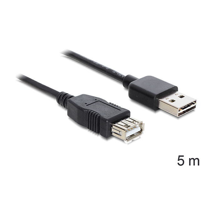 "DeLOCK EASY-USB 2.0-A - USB 2.0-A, 5m. Cable length: 5 m. Connector 1: USB A, Connector 2: USB A, USB version: USB 2.0, Connector gender: Male/Female, Maximum data transfer rate: 0.48 Gbit/s, Connector contacts plating: Gold, Product colour: Black"\n"This cable by Delock with EASY-USB male can be plugged into the USB A female port in both directions. Thus the male port can be used both-sided and make the plug in easily."