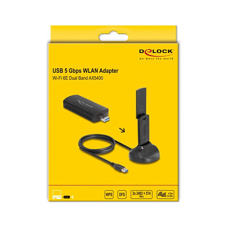 "DeLOCK 12774. Connectivity technology: Wired, Host interface: USB, Interface: WLAN. Maximum data transfer rate: 2402 Mbit/s, Top Wi-Fi standard: Wi-Fi 6E (802.11ax)"\n"Description