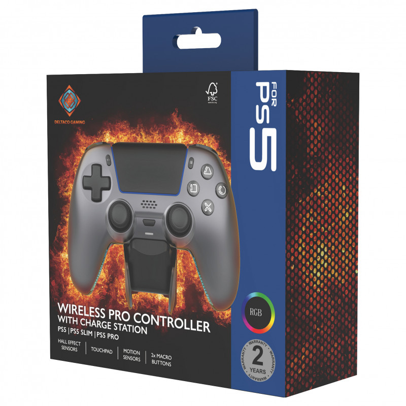 "Deltaco Gaming GAM-199-STEELGRAY. Device type: Gamepad, Gaming platforms supported: PlayStation 5, Android, iOS, Gaming control function buttons: D-pad, Home button, Share button, Options button, Reset button. Connectivity technology: Wired & Wireless, Device interface: Bluetooth/USB, USB connector type: USB Type-C. Product colour: Grey, Metallic, Steel, Housing material: Acrylonitrile butadiene styrene (ABS). Power source: Battery, Battery type: Built-in, Battery technology: Lithium. Mobile operating systems supported: iOS 13, iOS 13.4, iOS 14, iOS 14.3, iOS 14.5, iOS 15, iOS 16, iOS 17, iOS 18, iOS 26"\n"Upgrade your gameplay with the Wireless Pro Controller for PS5, designed for players who want more control, more style, and more performance.