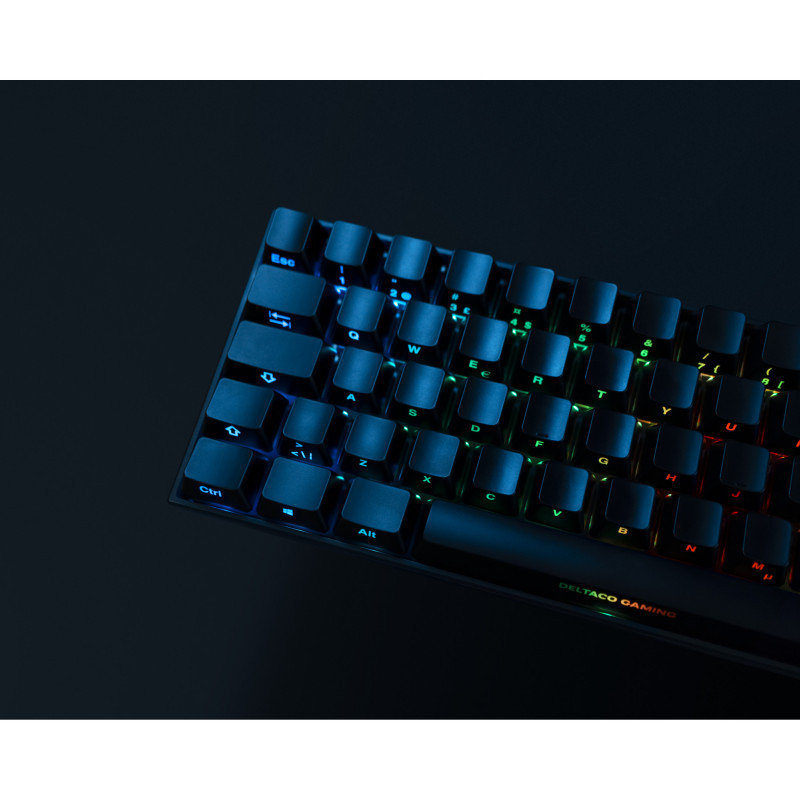 "Deltaco Gaming GAM-100-DE. Keyboard form factor: 65%. Keyboard style: Straight. Connectivity technology: Wired & Wireless, Device interface: USB + RF Wireless + Bluetooth, Keyboard key switch: Mechanical, Keyboard layout: QWERTZ, Keyboard number of keys: 68. Backlight type: RGB LED. Cable length: 1.8 m. Recommended usage: Gaming. Product colour: Black"\n"DELTACO GAMING DK440R Wireless 65% keyboard, front lasered keys, RGB, Kailh Red, N-key rollover, German Layout, black/RGB