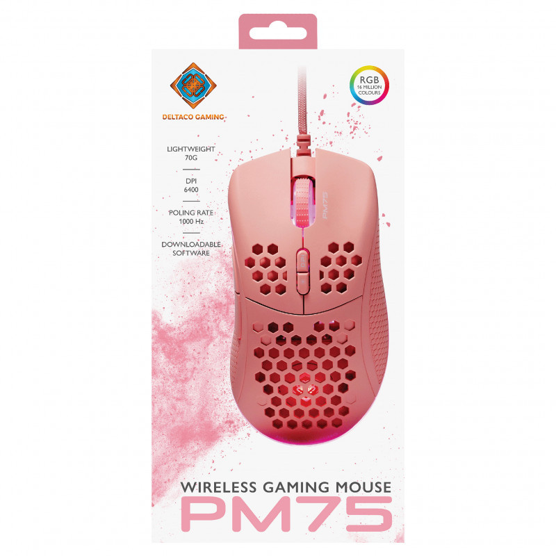 "Deltaco Gaming GAM-108-P. Connectivity technology: Wired, Device interface: USB, Keyboard number of keys: 7. Backlight type: RGB LED. Cable length: 1.8 m. Product colour: Pink"\n"Our first ultralight gaming mouse from our pink line PM75 gives you everything you need in a gaming mouse. Amazing RGB, ultra light weight and rubber coated side grips for that ultra control even in pressured situations. The 6 different DPI modes can be alternated via the top button while the button below helps with LED lighting.
