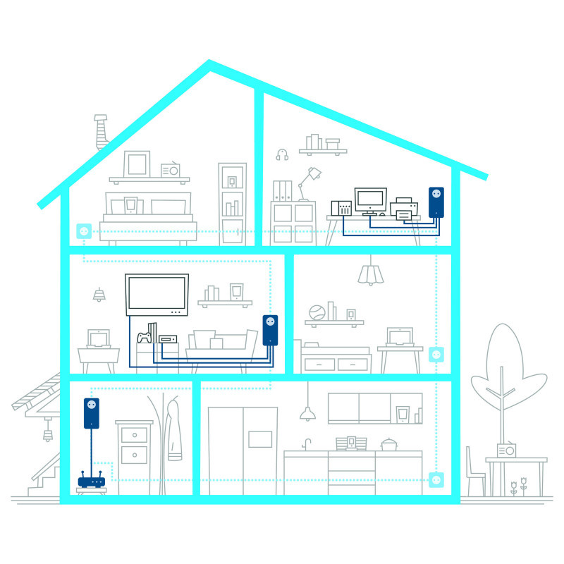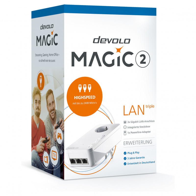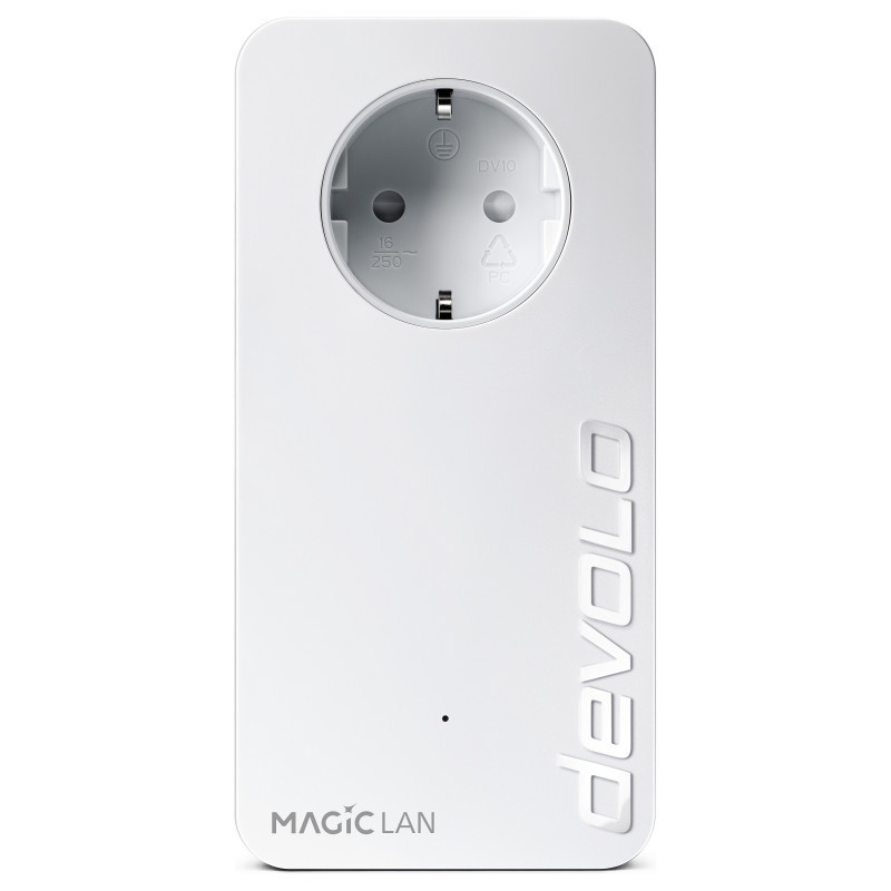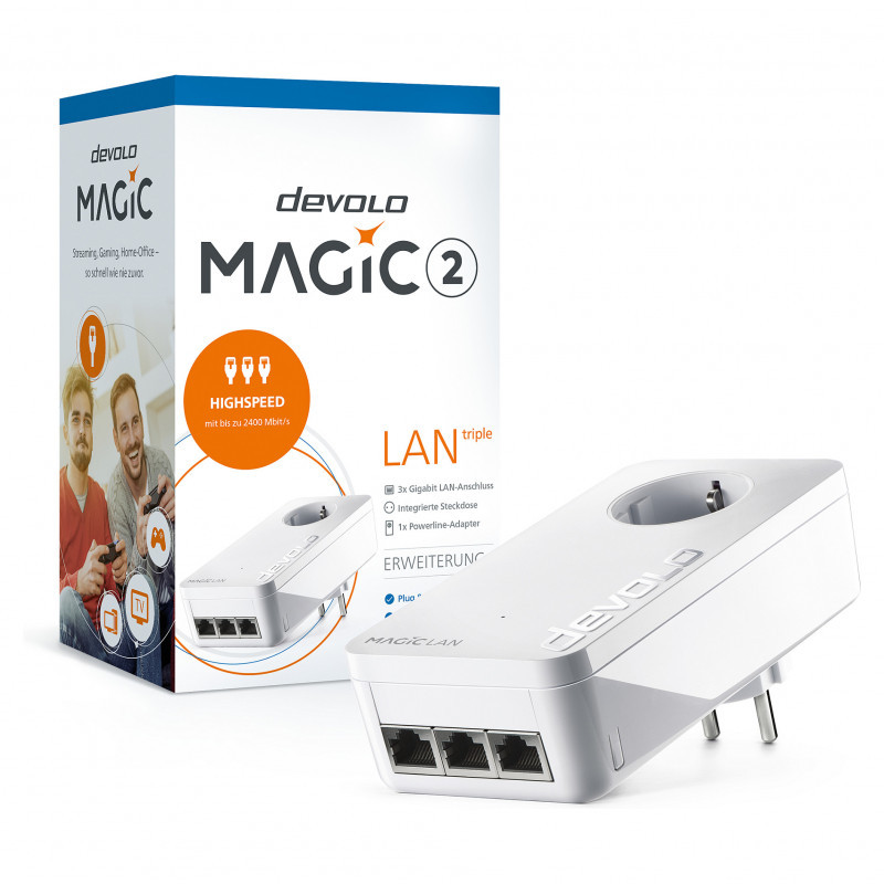 "Devolo Magic 2 LAN triple. Maximum data transfer rate: 2400 Mbit/s, Networking standards: IEEE 802.1p, IEEE 802.3, IEEE 802.3ab, IEEE 802.3u, IEEE 802.3x, Power plug: Type F. Power consumption (typical): 5 W, Power consumption (standby): 0.9 W, AC input voltage: 196 - 250 V. Product colour: White, LED indicators: PLC, Certification: CE. Windows operating systems supported: Windows 10, Windows 10 Pro, Windows 10 Pro x64, Windows 7, Windows 8, Windows 8 Pro, Windows 8 Pro..., Linux operating systems supported: Ubuntu 13.10, Ubuntu 14.04, Ubuntu 14.10, Ubuntu 15.04, Ubuntu 15.10, Mac operating systems supported: Mac OS X 10.10 Yosemite, Mac OS X 10.11 El Capitan, Mac OS X 10.12 Sierra, Mac OS X 10.9 Mavericks. Width: 143 mm, Depth: 72 mm, Height: 41 mm"\n