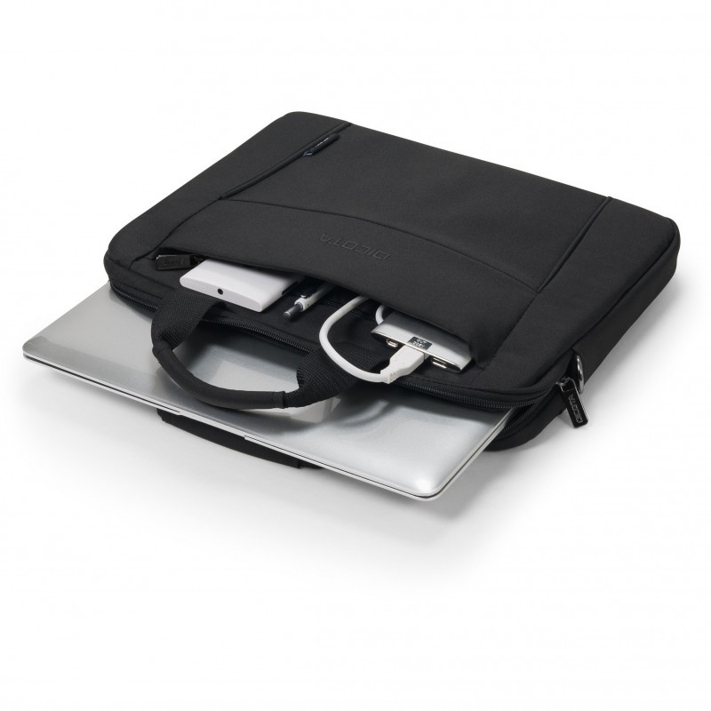 "DICOTA Eco Slim Case BASE. Maximum screen size: 35.8 cm (14.1""), Carrying handle(s), Shoulder strap. Weight: 350 g. Surface coloration: Monochromatic"\n"Today's actions shape tomorrow's world. Which is why, here at DICOTA, we are dedicated to developing environmentally friendly solutions and therefore make all the items in our ECO collections out of sustainable, recycled PET. We reuse up to 19 PET bottles, so you will receive an environmentally friendly product with a life-long guarantee. Our PET products also have the quality, look and finish that you know and love.