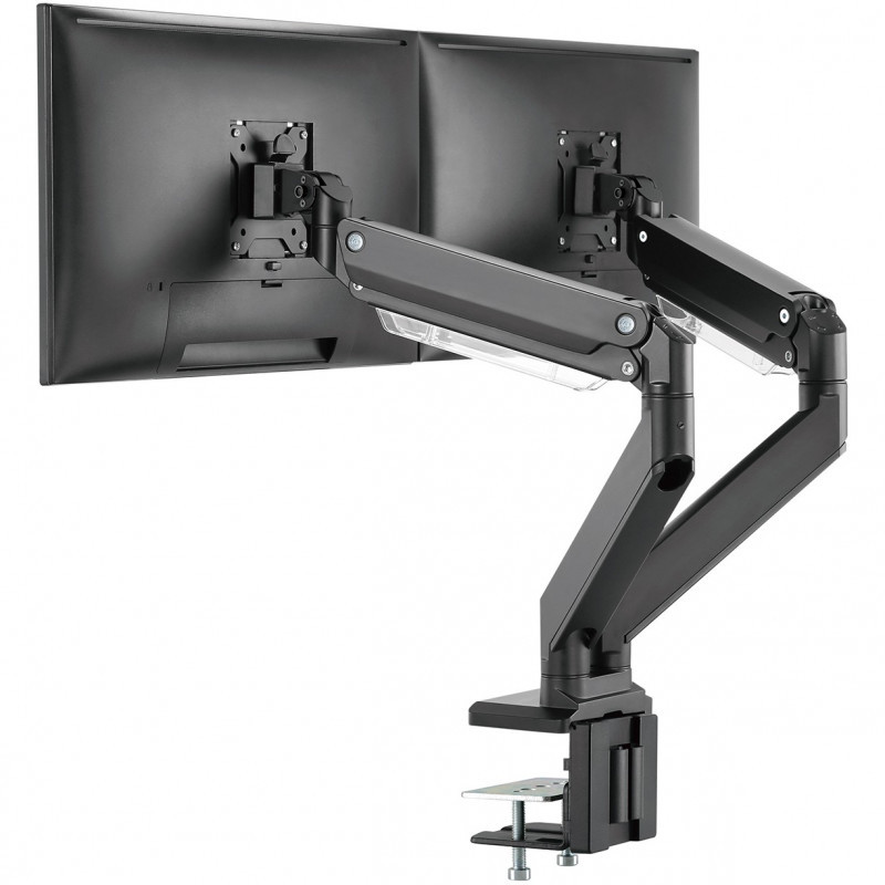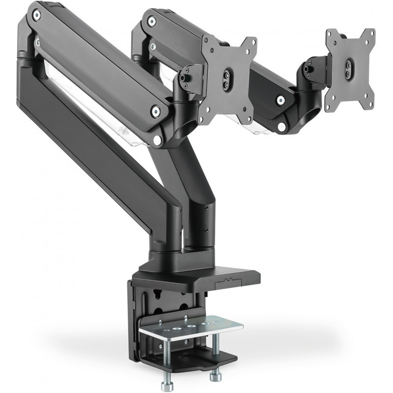 "Digitus Dual monitor mount, 2x 35"", 2x 15 kg. Maximum weight capacity: 15 kg, Minimum screen size: 38.1 cm (15""), Maximum screen size: 88.9 cm (35""), Minimum VESA mount: 75 x 75 mm, Maximum VESA mount: 100 x 100 mm. Tilt angle range: -45 - 45°, Swivel angle range: -90 - 90°, Angle of rotation: 360°. Product colour: Black"\n"The desktop mount offers you the option of individually aligning monitors up to 35"". The monitor can be swiveled, tilted and rotated. The integrated gas pressure spring makes height adjustment easy. With quick-release function.