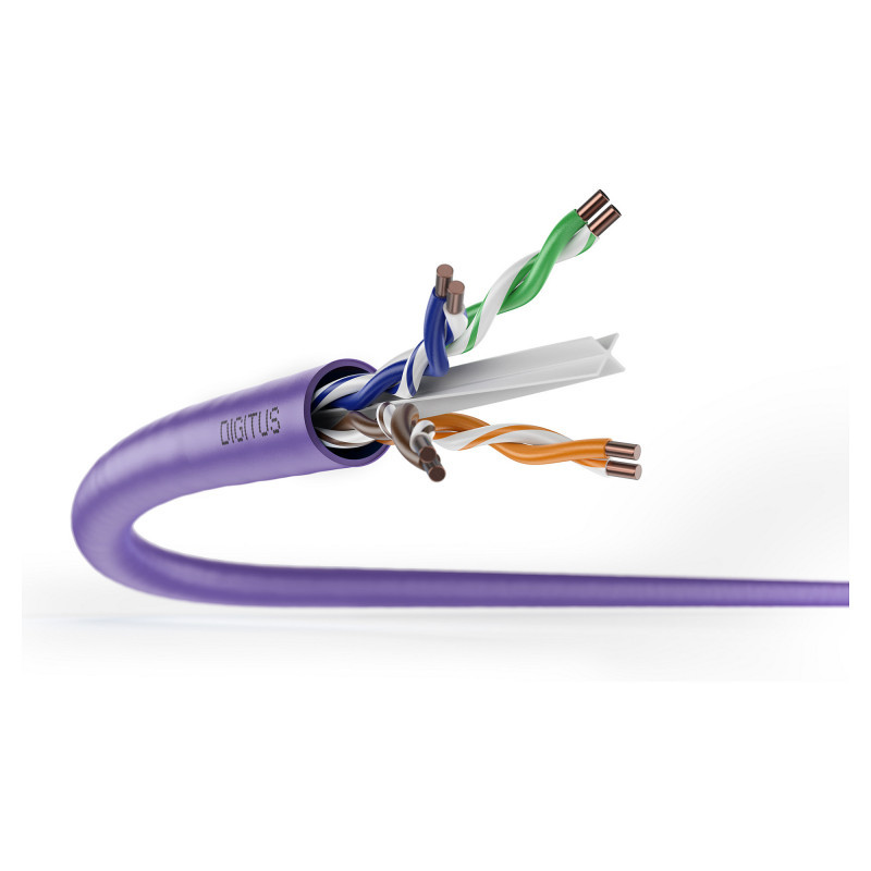 "Digitus CAT 6 U/UTP installation cable, 305 m, simplex, Eca. Cable length: 305 m, Cable standard: Cat6, Cable shielding: U/UTP (UTP), Product colour: Violet"\n"Future-oriented standards and high-end quality for your network.