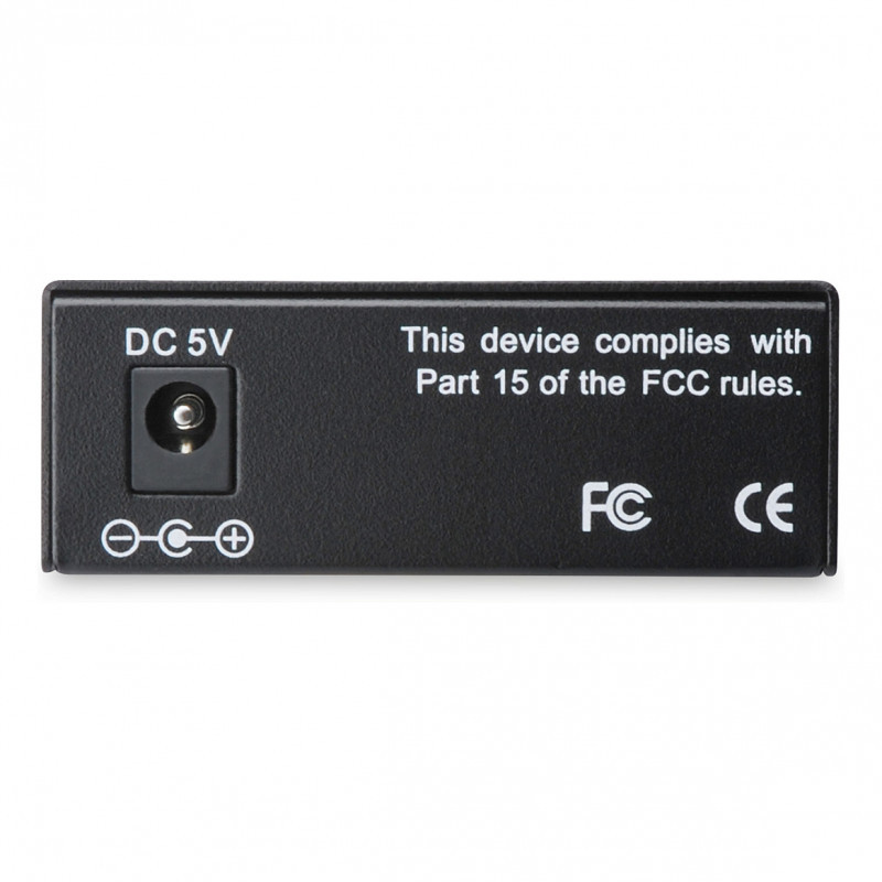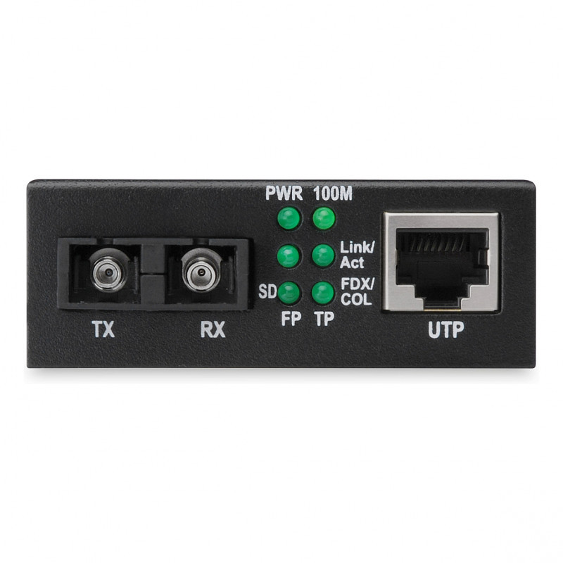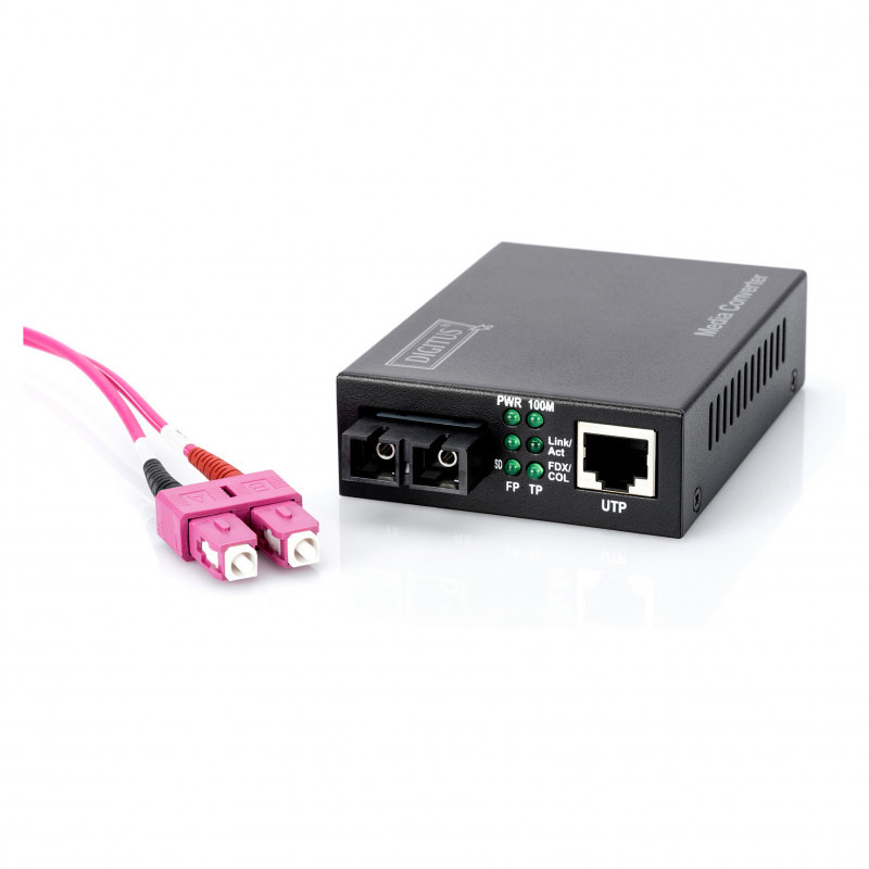"Digitus Fast Ethernet Media Converter, RJ45 / SC. Maximum data transfer rate: 100 Mbit/s, Converter input interface: 100Base-TX, Converter output interface: 100Base-FX. Maximum transfer distance: 2000 m, Wavelength: 1310 nm, Fiber mode structure: Multi-mode. LED indicators: Activity, Link, Status, Product colour: Black. Fiber optic connector: SC, Connectivity technology: Wired. Input voltage: 5 V, Input current: 0.8 A, Power consumption (typical): 2.5 W"\n"The perfect converter solution for various fiber media