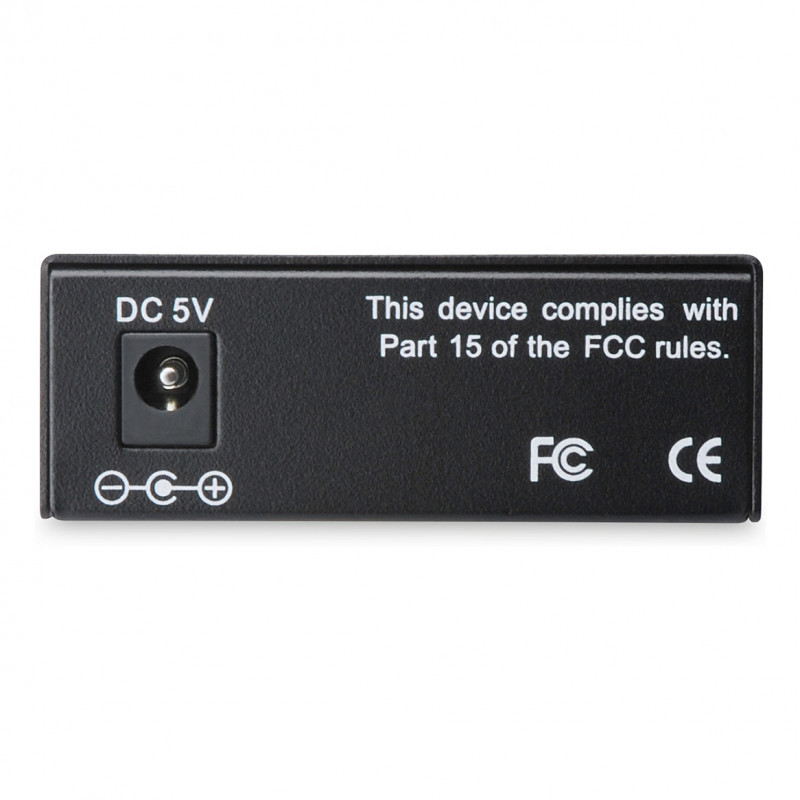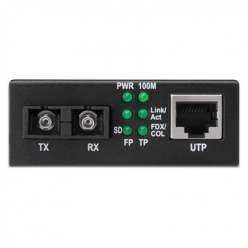 "Digitus Fast Ethernet Media Converter, RJ45 / SC. Converter input interface: 100Base-TX, Converter output interface: 100Base-FX, Networking standards: IEEE 802.3, IEEE 802.3u. Maximum transfer distance: 20000 m, Wavelength: 1310 nm, Fiber mode structure: Single-mode. LED indicators: Activity, Link, Status, Product colour: Black. Fiber optic connector: SC, Connectivity technology: Wired. Input voltage: 5 V, Power consumption (typical): 2.5 W"\n"The perfect converter solution for various fiber media