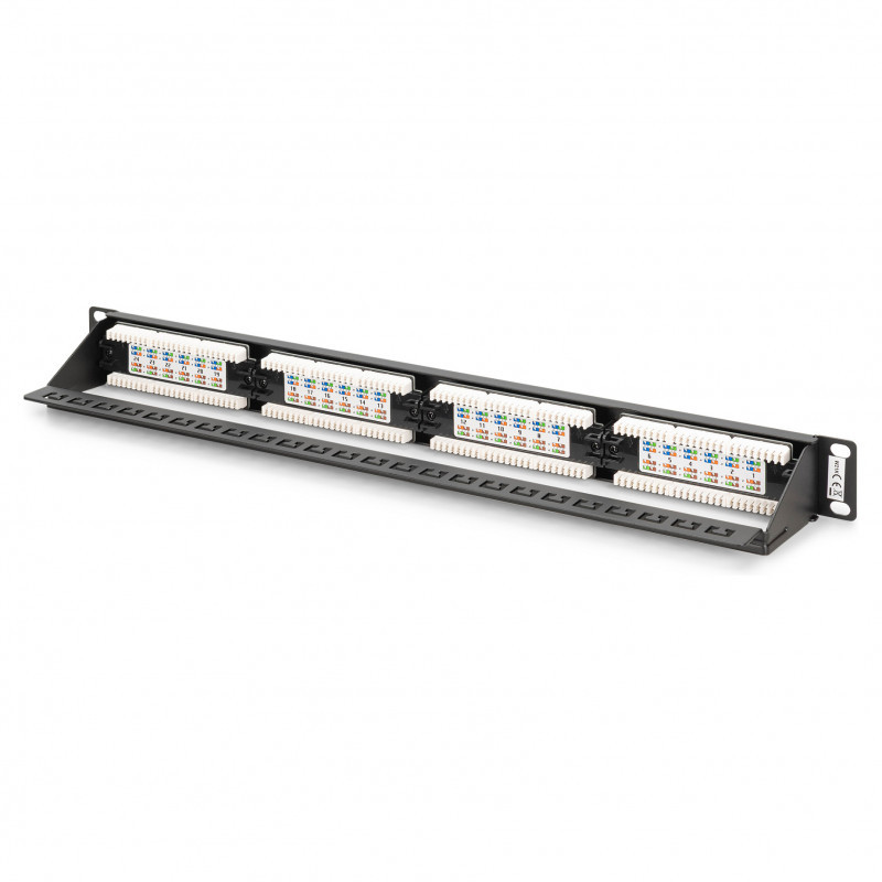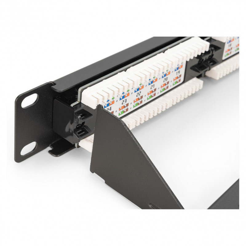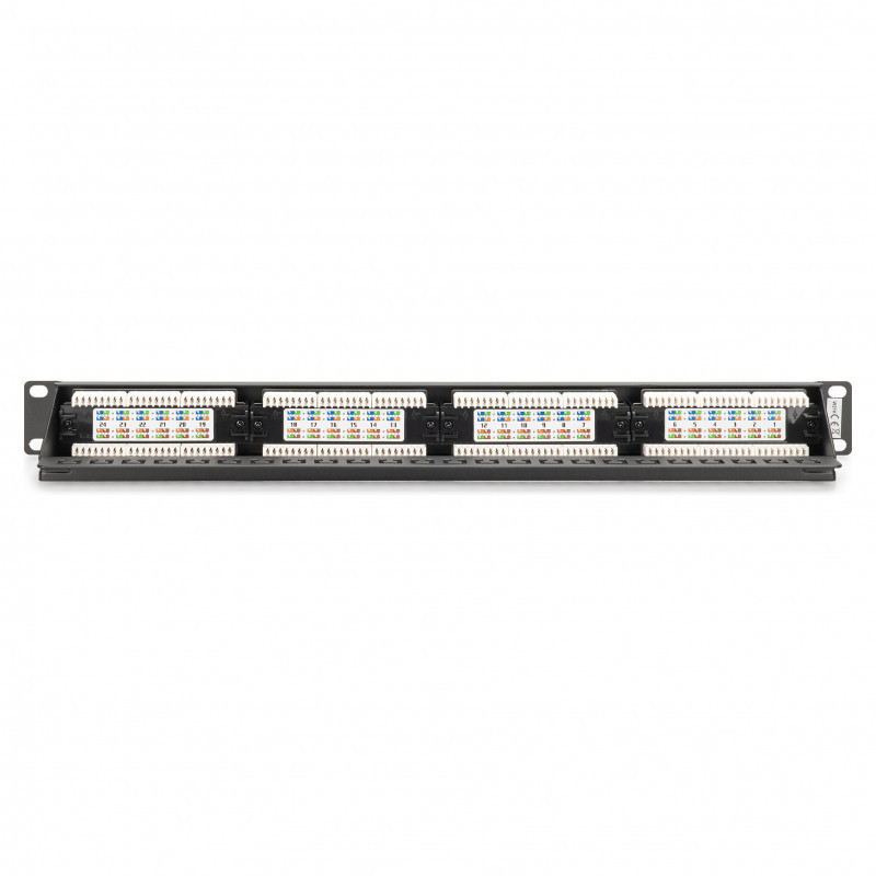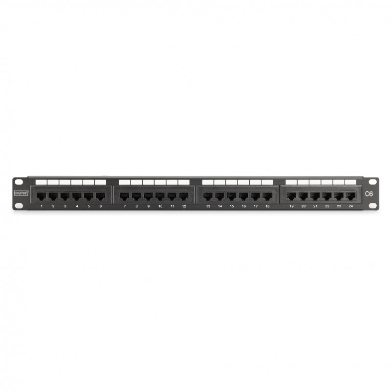 "Digitus CAT 6, class E patch panel, unshielded. Cabling technology: 10/100/1000Base-T(X), Connector(s): RJ-45, Connector contacts plating: Nickel. Mounting: Rack mounting, Rack capacity: 1U, Product colour: Black. Width: 485 mm, Height: 45 mm, Depth: 30 mm. Package width: 560 mm, Package depth: 80 mm, Package height: 100 mm"\n"Future-oriented standards and high-end quality for your network.