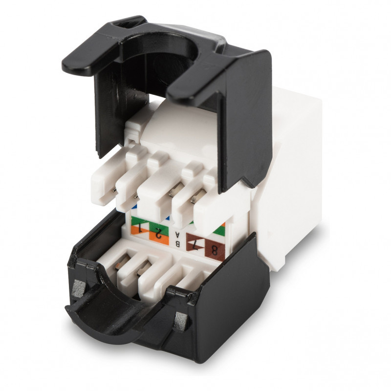 "Digitus CAT 5e, Class D Keystone Module, unshielded, toolfree. Product colour: Black, White. Width: 30 mm, Depth: 20 mm, Height: 25 mm. Package width: 90 mm, Package height: 100 mm. Country of origin: China"\n"Future-oriented standards and high-end quality for your network.
