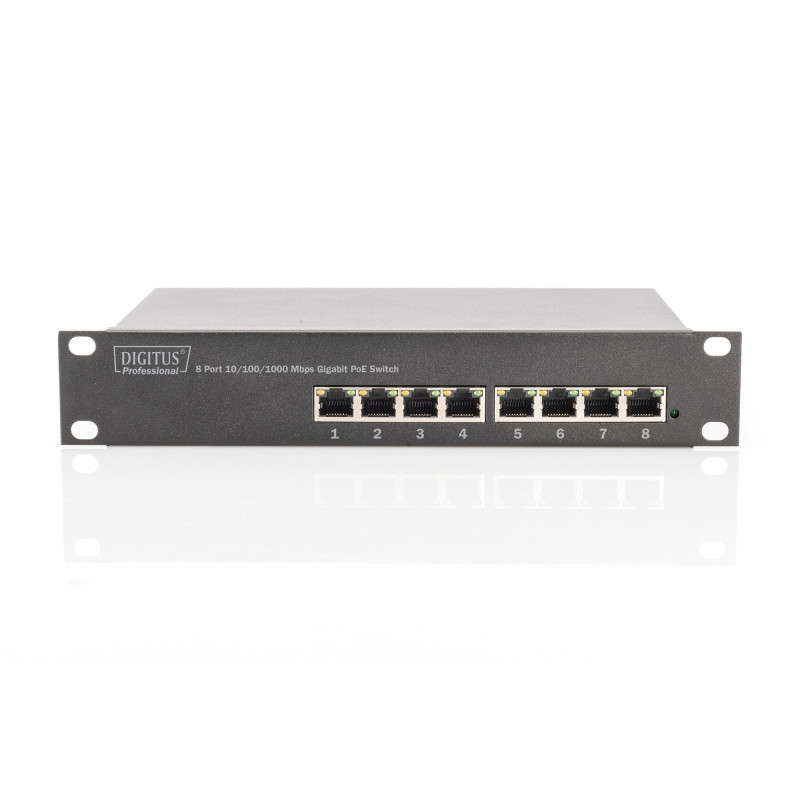 "Digitus 8 Port Gigabit PoE Switch, 10 Inch, Unmanaged. Switch type: Unmanaged. Basic switching RJ-45 Ethernet ports type: Gigabit Ethernet (10/100/1000), Basic switching RJ-45 Ethernet ports quantity: 8. Full duplex. MAC address table: 8000 entries, Switching capacity: 16 Gbit/s. Networking standards: IEEE 802.3at. Power over Ethernet (PoE). Rack mounting"\n"Ideal for use in 10"" wall cabinets