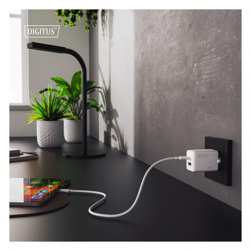 "Digitus USB GaN Charger 45W, 1x USB-C, 1x USB-A. Charger type: Indoor, Power source type: AC, Charger compatibility: Universal. Input voltage: 100 - 240 V. USB Type-C ports quantity: 1, Fast charging, Power protection features: Over current, Overheating, Short circuit. Product colour: White"\n"The USB GaN II Charger 45W offers enough power to charge smartphones, tablets and even light laptops reliably and quickly - compact, efficient and perfect for any journey.