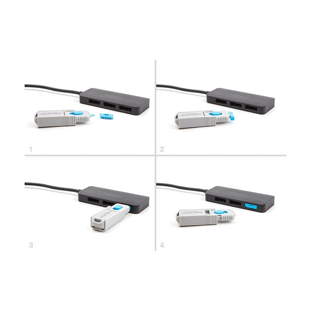 The shape of the tool is reminiscent of a USB stick and, with the eyelet at the rear end, offers the possibility of attaching the port blocker to a key ring, for example."