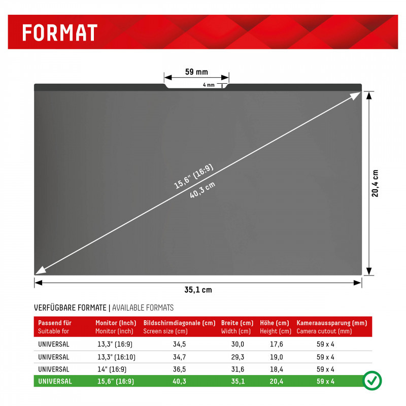"Displex PRIVACY SAFE magnetic 2-way privacy filter for Laptop/ Notebook 15,6'' (16:9). Maximum screen size: 39.6 cm (15.6""). Aspect ratio: 16:9. Suitable for: Laptop, Type: Frameless display privacy filter. Surface finish: Glossy / Matt, Protection features: Dust resistant, Scratch resistant, Hardness: 5H, Limits viewing angle: 30°"\n"Highly effective 2-way privacy filter protects the screen from scratches and damage and limits the field of view to+/- 30°. I.e. from an angle of approx. 30° the display appears black, so that your privacy and sensitive data are protected from unwanted side views, compliance with the General Data Protection Regulation (GDPR) is supported.