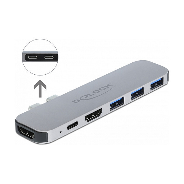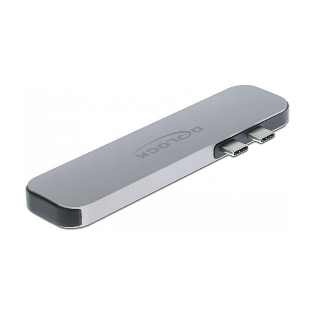 "DeLOCK Docking Station for MacBook Dual HDMI 4K / PD / Hub. Connectivity technology: Docking, USB Power Delivery up to: 60 W. Product colour: Grey, Maximum digital resolution: 3840 x 2160 pixels, Housing material: Metal. Power source type: USB. Width: 28 mm, Depth: 116 mm, Height: 9.5 mm. Quantity per pack: 1 pc(s)"\n"This docking station by Delock can be connected to a MacBook with two adjacent Thunderbolt 3 ports, e.g. the MacBook Pro. Two monitors can be operated simultaneously at the HDMI output ports. Three built-in USB Type-A ports allows the use of peripherals.