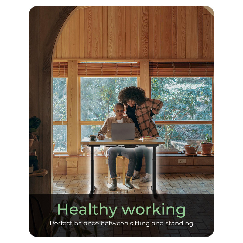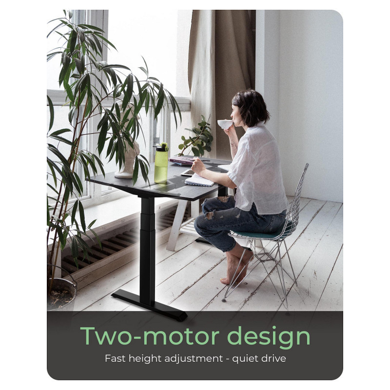 We have the powerful, smooth-running, stable, quiet and continuously adjustable table base with two motors for trouble-free height adjustment with up to 38 mm per second lifting speed. 3-stage extendable table legs provide a split-second transition from sitting to standing at the touch of a finger. Thanks to the digital LED control unit, adjustments can be made at the touch of a button. Three programmable memory presets store your desired height settings and provide automatic reminders to switch between standing and sitting for regular exercise.