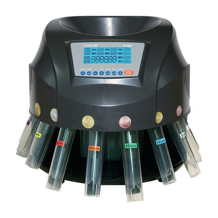 "Olympia CC 202. Width: 321 mm, Depth: 321 mm, Height: 270 mm. Power source type: AC. Display: LCD. Package type: Box"\n"- Coin sorter for Euro coins