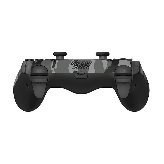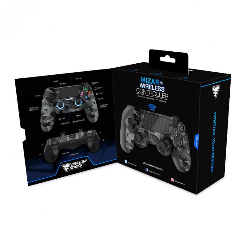 "Dragonshock Mizar+. Device type: Gamepad, Gaming platforms supported: PC, PlayStation 4, Android, Gaming control function buttons: D-pad, Home button, Turbo button, Reset button, Options button, Share button. Connectivity technology: Wireless, Device interface: Bluetooth, USB connector type: USB Type-C. Product colour: Black, Grey, Camouflage, Cable length: 2 m. Power source: Battery, Battery type: Built-in, Battery technology: Lithium-Ion (Li-Ion). Weight: 208 g"\n"Gear up for total control. The MIZAR+ Full Grey Camo blends tactical design with elite performance, putting next-gen precision in your hands for PS4™, PC, and Android.