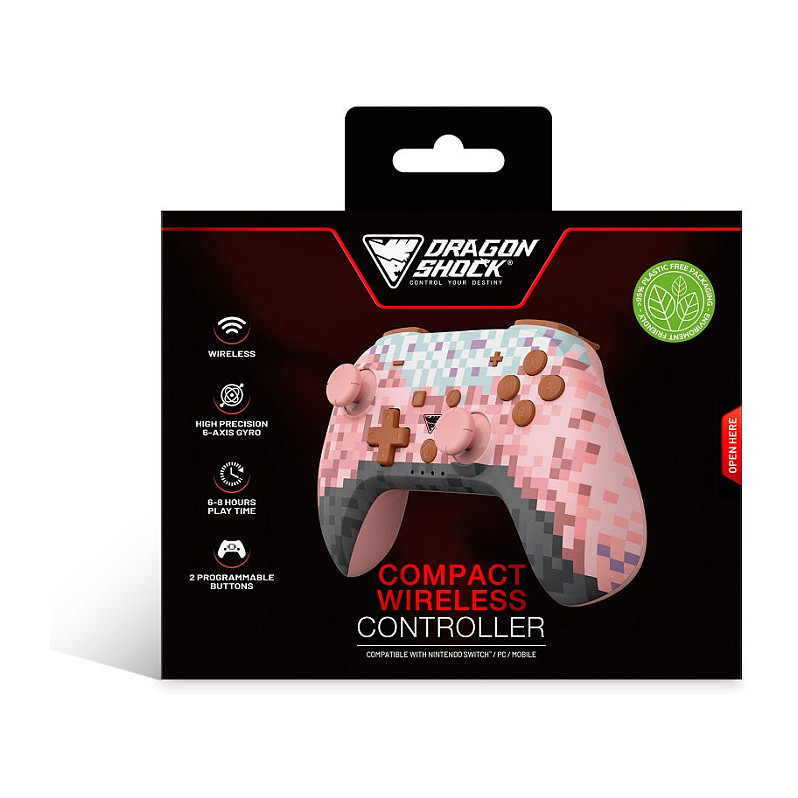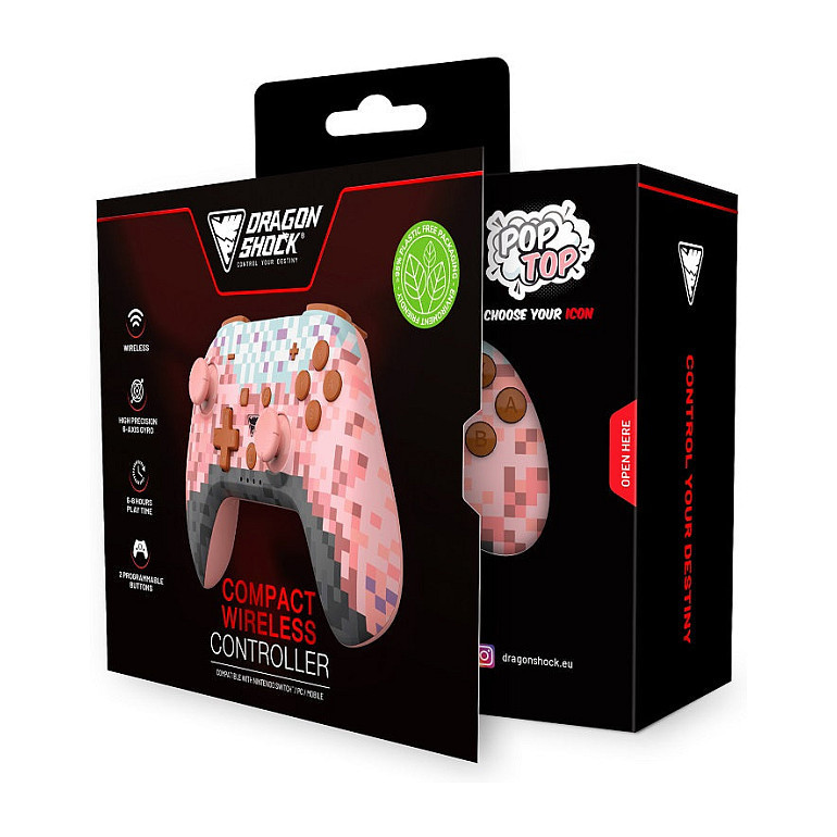 "Dragonshock PopTop. Device type: Gamepad, Gaming platforms supported: Nintendo Switch, PC, Gaming control function buttons: D-pad, Home button, Turbo button, Reset button, Start button. Connectivity technology: Wireless, Device interface: Bluetooth, USB connector type: USB Type-C. Product colour: Pink, Brown, Black, Light Blue, Purple, Cable length: 2 m. Power source: Battery, Battery type: Built-in, Battery technology: Lithium-Ion (Li-Ion). Weight: 165 g"\n"Step into a blocky world of endless adventure. The PopTop Pink Cube blends bold pixel style with pro-level performance for Nintendo Switch™ players ready to build, battle, and explore without limits.