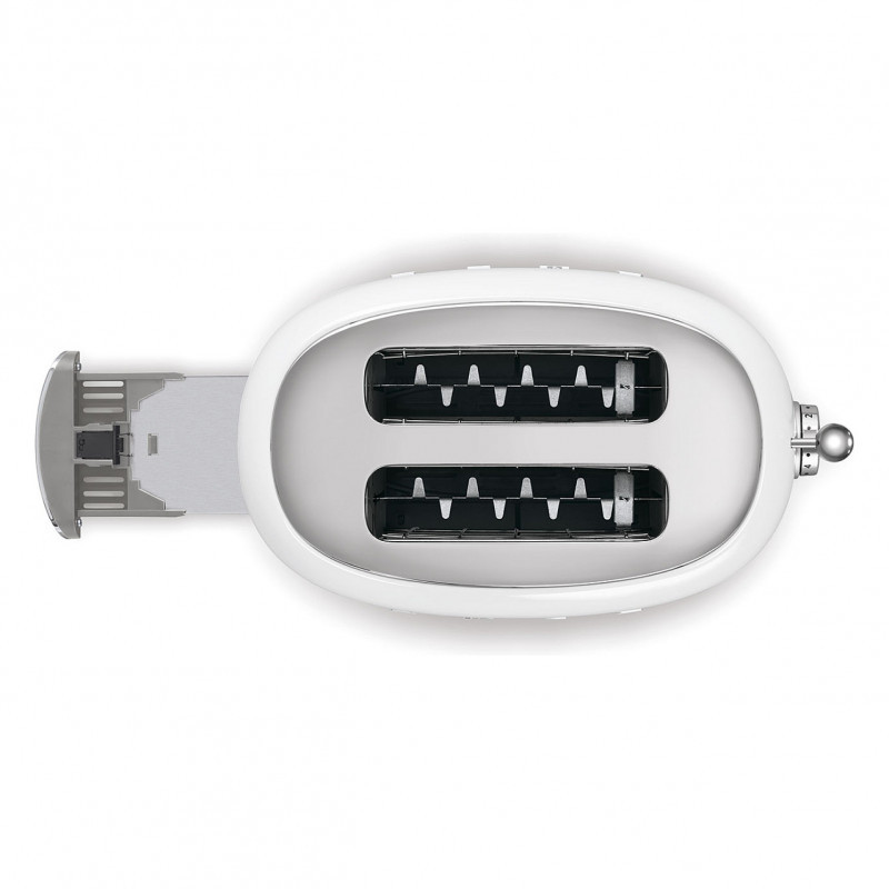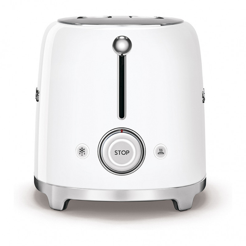 "Smeg 50's Style Toaster TSF01WHEU White. Number of slices: 2 slice(s), Product colour: White, Housing material: Stainless steel. Power: 950 W, AC input voltage: 220-240 V, AC input frequency: 50-60 Hz. Cord length: 1 m, Width: 195 mm, Depth: 310 mm. Country of origin: China. Products per intermodal container (20ft): 1200 pc(s), Products per intermodal container (40ft): 2448 pc(s), Products per intermodal container (40ft, HC): 3060 pc(s)"\n"Smeg's iconic retro design offers a pop of colour and a premium enamelled finish. Whether you're preparing breakfast before the school run, or a luxurious breakfast in bed, the Smeg TSF01 two slot toaster has got it covered. This two slice toaster is perfect those who like to make a statement in the kitchen, but can also handle warming pastries, bagels, and toasting treats!