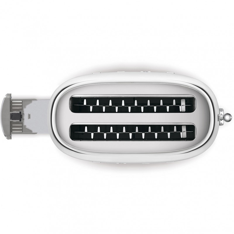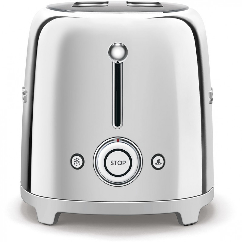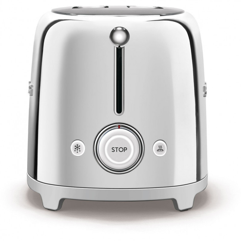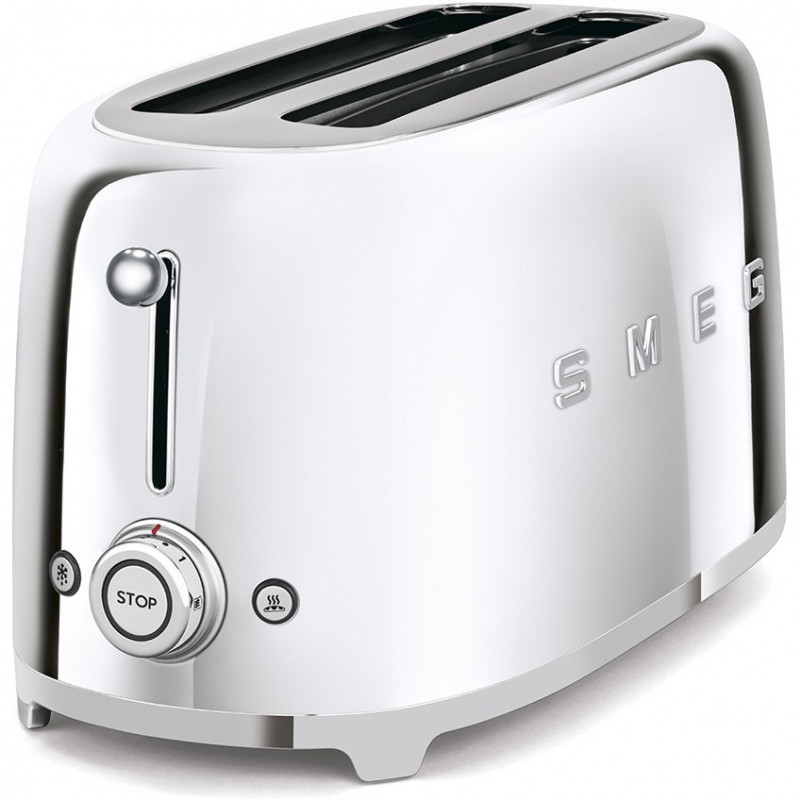 "Smeg 50's Style Toaster TSF02SSEU Steel. Number of slices: 4 slice(s), Product colour: Chrome, Housing material: Steel. Power: 1500 W, AC input voltage: 220 - 240 V, AC input frequency: 50 - 60 Hz. Cord length: 1 m, Width: 394 mm, Depth: 208 mm. Country of origin: China. Pallet gross weight: 260.2 kg, Layers per pallet: 7 pc(s), Products per pallet layer: 7 pc(s)"\n"Smeg's iconic retro design offers a pop of colour and a premium enamelled finish. Smeg's TSF02 features two long extra wide bread slots which can accommodate a variety of bread thicknesses including toasting baguettes, thick farmhouse loafs and artisan breads. Each slot features a self-centering rack to ensure even toasting and once the selected toasting time has finished, the slices pop up automatically.