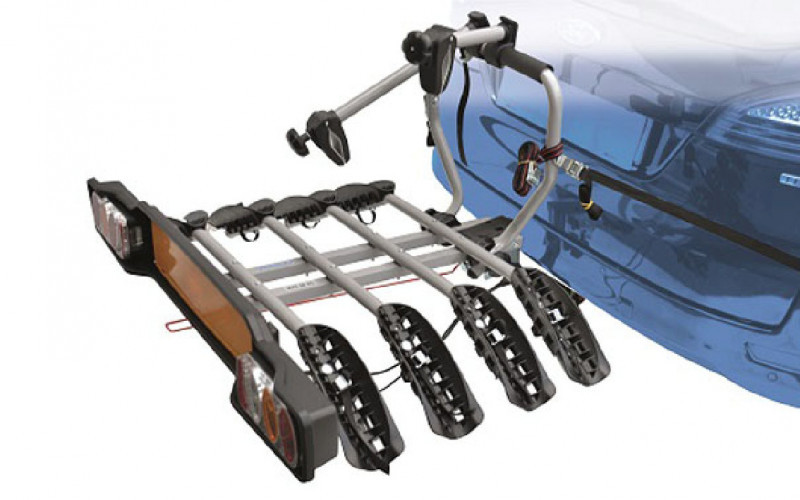 plieninis, 3 dviračiams 29", max apkrova 3 x 20 kg, greito uždėjimo svertas, atlenkiamas, netrukdo bagažinei, EU standarto numerio laikiklis su lempomis, 17.4 kg