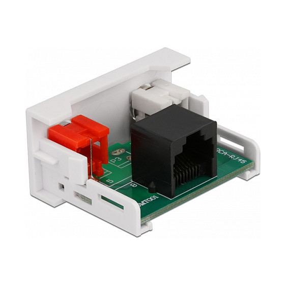 "DeLOCK Easy 45 Module 2 x RCA female to RJ45 female port 22.5 x 45 mm. Connector(s): 2 x RCA, Product colour: Black, White, Connector gender: Female/Female. Width: 45 mm, Depth: 22.5 mm, Height: 39 mm. Quantity per pack: 1 pc(s), Package type: Box. Country of origin: China"\n"This Easy 45 module by Delock is designed to provide two RCA female ports. The simple snap-in mechanism ensures that the module is firmly in place and can be easily removed if necessary. A pre-installed network cable e.g. can be connected or extended to the RJ45 socket.