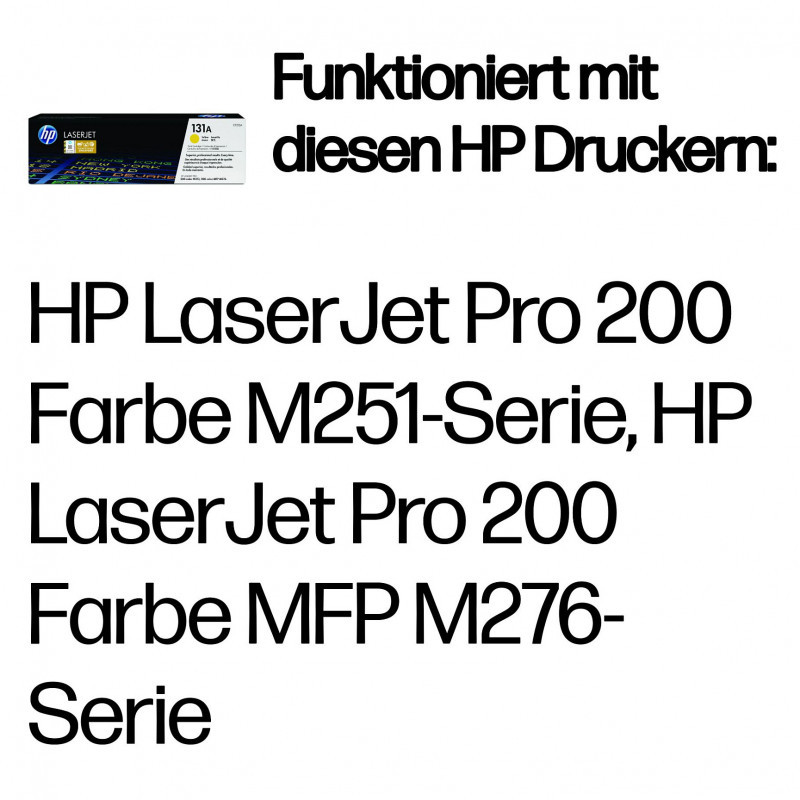 "HP 131A Yellow Original LaserJet Toner Cartridge. Colour toner page yield: 1800 pages, Printing colours: Yellow, Quantity per pack: 1 pc(s)"\n"Ideal for printing professional-quality documents and marketing materials in the office, with consistent, high-quality results.