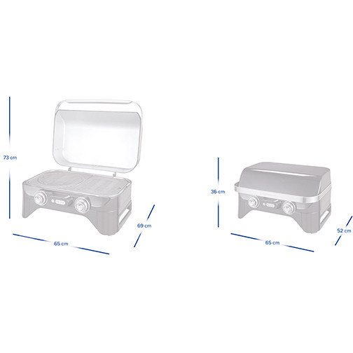 "Campingaz Attitude 2100 EX. Total power: 5000 W, Type: Grill, Heat source: Gas. Form factor: Tabletop, Product colour: Black, Stainless steel, Cooking surface shape: Rectangular. Number of legs: 4 leg(s), Lid material: Aluminium, Control type: Rotary. Width: 650 mm, Depth: 520 mm, Height: 730 mm"\n