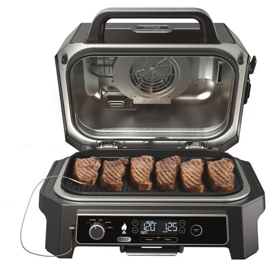 "Ninja OG850EU. Total power: 1700 W, Type: Grill, Heat source: Electric. Top surface type: Griddle, Product colour: Black, Grey, Cooking surface shape: Rectangular. Control type: Rotary, Touch. Width: 570 mm, Depth: 510 mm, Height: 410 mm. Barbecue accessories included: Meat thermometer"\n