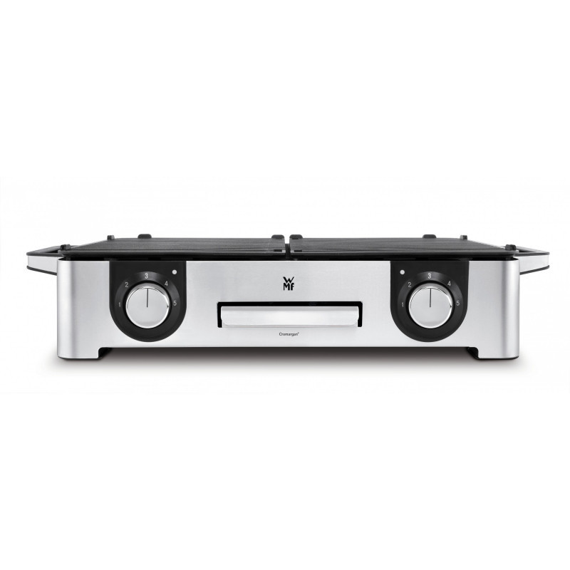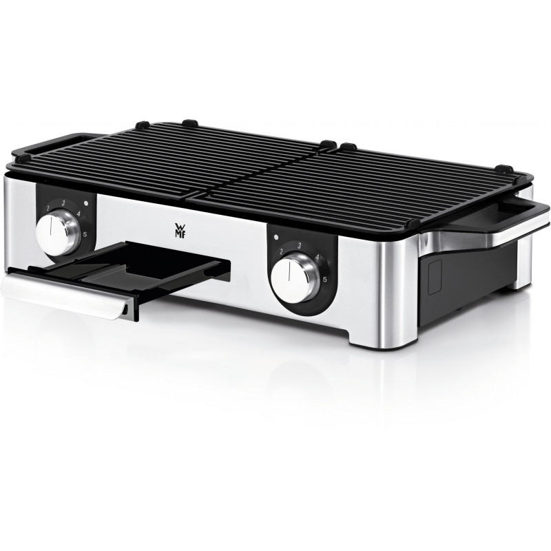 The WMF LONO Master Grill made of matt Cromargan is ideal for grilling enjoyment inside and outdoors. With a 28 x 50 cm grill area, the LONO Master Grill offers plenty of space for preparing large and varied grilled dishes. It has two separate ribbed grill plates whose temperatures can be freely adjusted using separate controls with LED lighting. In the LONO Master Grill, the heating element is also built into the two extra thick cast aluminium grill plates. The LONO Master Grill not only offers plenty of space, its 2,400 watt output guarantees perfect grill results. The removable fat collection tray and the two grill plates are dishwasher safe. It is also equipped with a removable wind and splash guard for outdoor use."