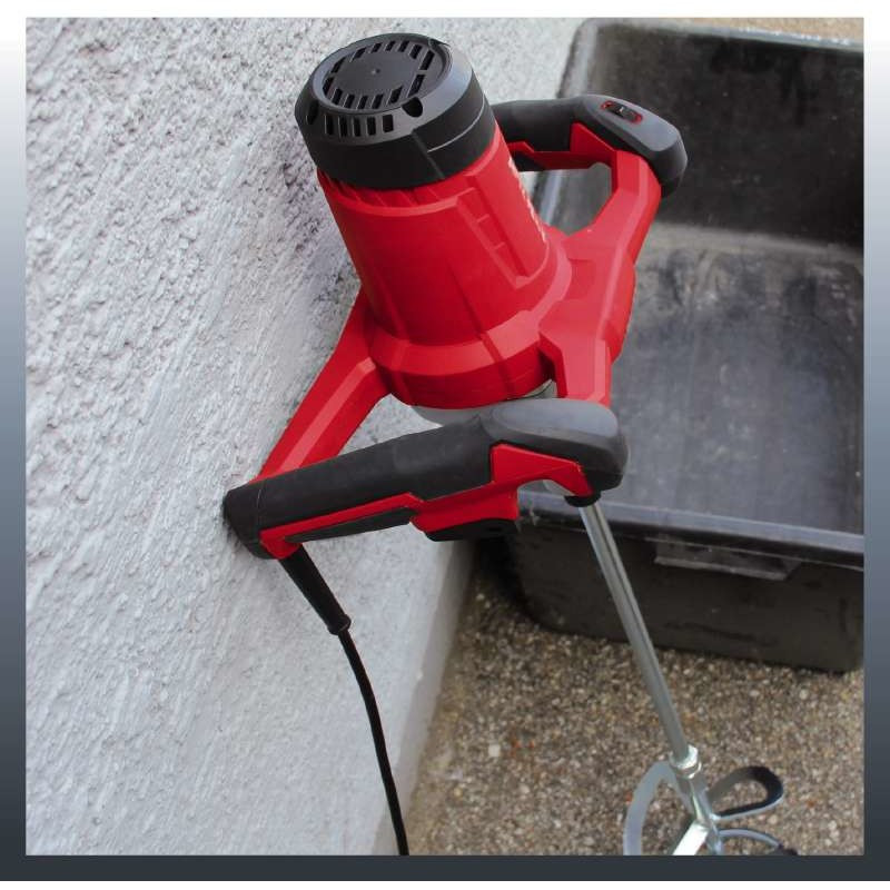 "Einhell TE-MX 1600-2 CE. Best uses: Mortar, Paint, Powder, Product colour: Black, Red, Spindle thread: M14. Idle speed: 750 RPM. Input power: 1600 W, AC input voltage: 220-240 V, AC input frequency: 50 Hz. Weight: 3.48 kg, Width: 330 mm, Depth: 325 mm"\n"When mixing fluid and powdery construction materials, experts swear by the high-quality powerful paint-/mortar mixer with constant electronics TE-MX 1600-2 CE. Its two-speed gear unit in a robust and durable metal aluminium housing converts the power of the 1,600 W motor either into a high torque or into high speed so that the required speed of mixing can be adjusted optimally to the consistency of the mixed material. Due to its big ergonomic handlebar, the mortar mixer always lays in the hand perfectly, and the 3 m long robust rubber cable offers a sufficient radius to work at any time. The stirrer starts smoothly by means of the soft start feature, and inbuilt dynamic speed control allows the precise adjustment of the speed without a speed reduction on-load even during operation. For comfortable continuous operation, the device has a lockable operation switch and a stand mount at the gear neck to work with already existing stirrer stands. All common stirring tools with M14 thread can be operated at the robust stirrer mount. Additionally, a mortar stirrer with Ø 133 mm is included in the scope of delivery."