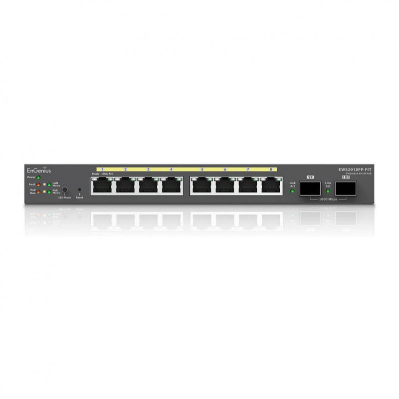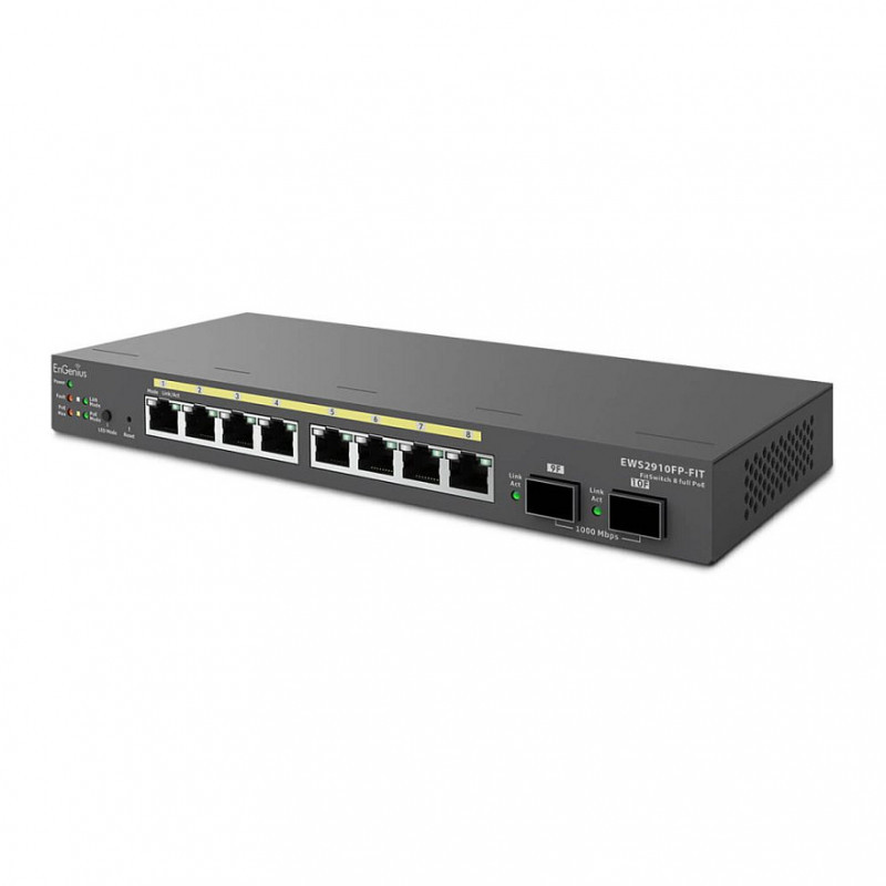 "EnGenius Switch 8-port GbE PoE.af/at(+) 130W, 2xSFP Desktop wall-mountable. Switch type: Managed, Switch layer: L2/L3. Basic switching RJ-45 Ethernet ports type: Gigabit Ethernet (10/100/1000), Basic switching RJ-45 Ethernet ports quantity: 8, Installed SFP modules quantity: 2. MAC address table: 8000 entries, Switching capacity: 20 Gbit/s. Networking standards: IEEE 802.3, IEEE 802.3ab, IEEE 802.3u, IEEE 802.3x. Power over Ethernet (PoE)"\n"EnGenius Fit Gigabit 8-Port 110W PoE+ Switch with 2 SFP Ports