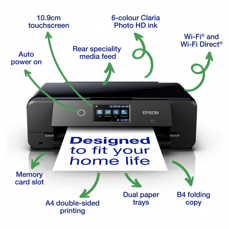 "Epson XP-980. Print technology: Inkjet, Printing: Colour printing, Maximum resolution: 5760 x 1440 DPI, Print speed (colour, normal quality, A4/US Letter): 28 ppm. Copying: Colour copying. Scanning: Colour scanning, Optical scanning resolution: 1200 x 4800 DPI. Duplex functions: Print. Maximum ISO A-series paper size: A3. Wi-Fi. Direct printing. Product colour: Black"\n"The Expression Photo XP-980 is great if you're looking to produce superior, glossy photographs up to A3. It has a range of connectivity solutions including Wi-Fi, Wi-Fi Direct and Ethernet. It features mobile printing, a large touchscreen and A4 double-sided printing."