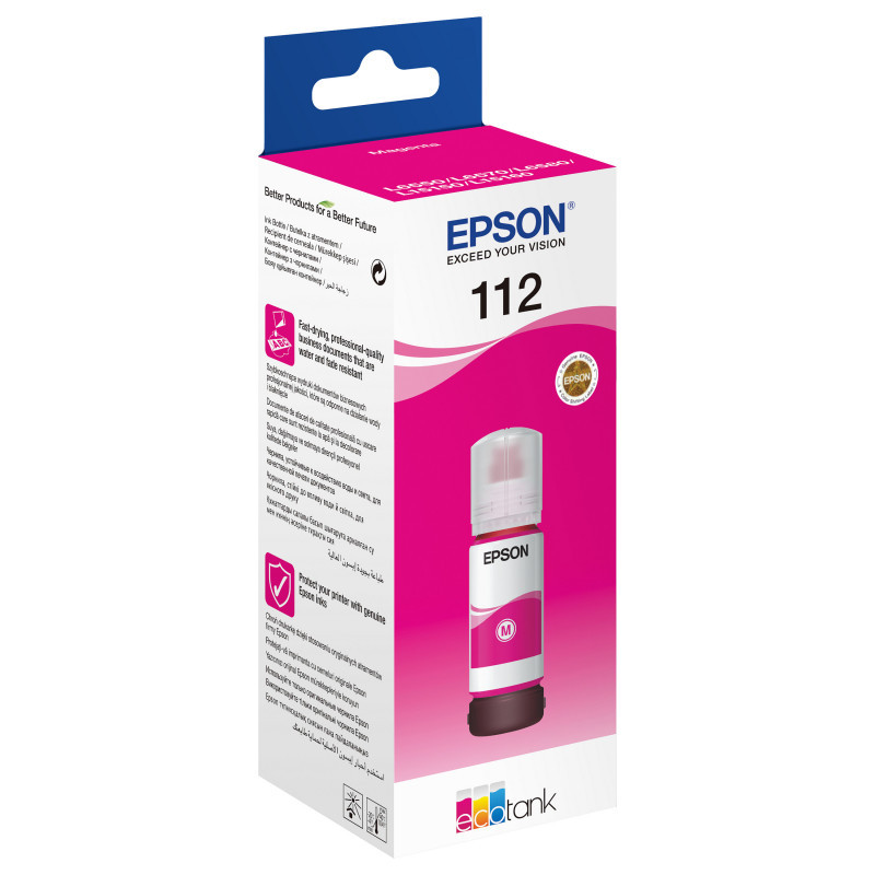 "Epson EcoTank 112. Type: Original, Printing colours: Pigment magenta, Brand compatibility: Epson. Quantity per pack: 1 pc(s), Package type: Box"\n"C13T06C34A