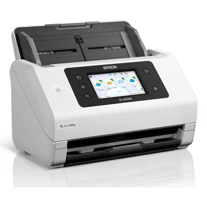 "Epson WorkForce DS-800WN. Maximum scan size: 215.9 x 6096 mm, Optical scanning resolution: 600 x 600 DPI, Input colour depth: 30 bit. Scanner type: Sheet-fed scanner, Product colour: White, Display: LCD. Daily duty cycle (max): 8000 pages, Scan file formats: BMP, JPEG, PDF, PNG, TIFF, Scan to: Cloud, E-mail, Network folder, PC, USB. Standard input capacity: 100 sheets, Auto document feeder (ADF) input capacity: 100 sheets. Maximum ISO A-series paper size: A4, Scanning media types supported: Business Card, Envelopes, Plastic Card, ISO A-series sizes (A0...A9): A3, A4, A5, A6"\n"Open platform