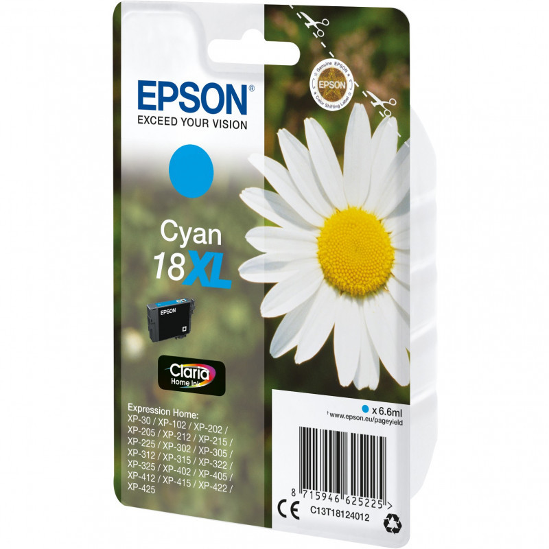 "Epson Daisy Singlepack Cyan 18XL Claria Home Ink. Cartridge capacity: High (XL) Yield, Colour ink page yield: 450 pages, Colour ink volume: 6.6 ml, Printing colours: Cyan, Quantity per pack: 1 pc(s)"\n"Save up to 30% ink1 with Epson’s individual ink cartridges