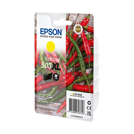 "Epson 503XL. Cartridge capacity: High (XL) Yield, Supply type: Single pack, Colour ink page yield: 503 pages, Colour ink volume: 6.4 ml, Printing colours: Yellow, Quantity per pack: 1 pc(s)"\n"Epson's reliable four colour individual inks are ideal for everyday printing. There’s an affordable cartridge to suit every type of user, with both standard and XL sizes available in Single and Multipacks. Find them easily in store by looking for the Chillies image.